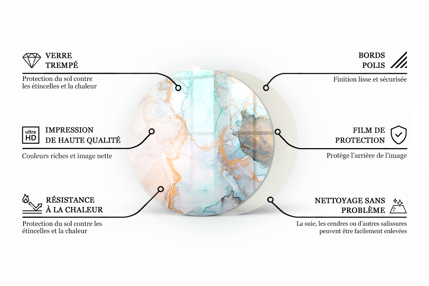 Plaque verre ronde sous poêle grain de bois naturel est l’alliance d’une esthétique moderne et d’une protection fonctionnelle du sol. Fabriquée en verre trempé résistant, elle se distingue par un design transparent et minimaliste qui s’intègre parfaitement à différents styles d’aménagement intérieur. Sa surface transparente rend la plaque presque invisible, apportant de la légèreté à l’espace et mettant subtilement en valeur la cheminée sans dominer la décoration.