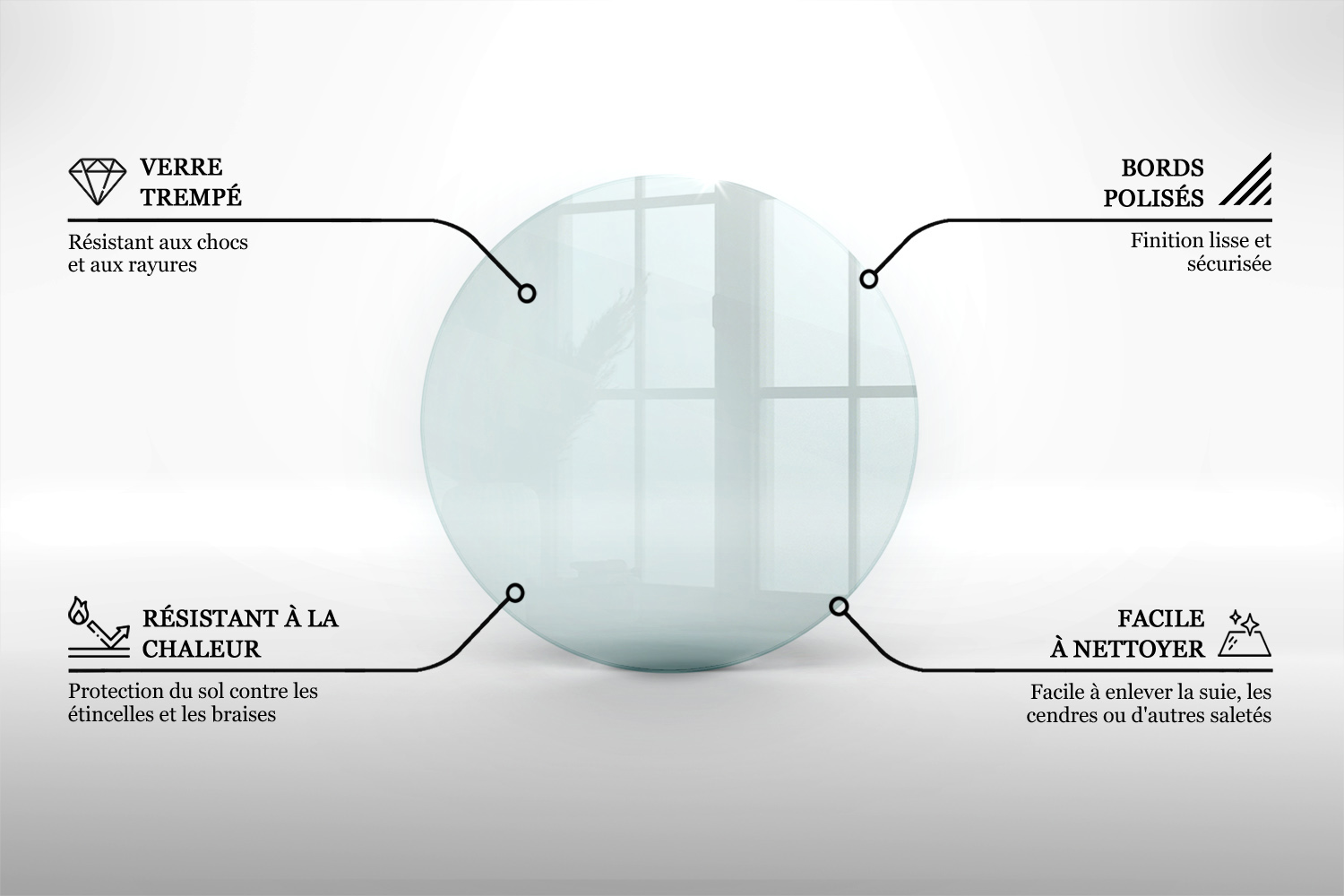 La haute transmissibilité de la lumière laisse apparaître la texture de votre parquet, carrelage ou pierre naturelle, pour un effet décoratif subtil mais bien réel. Facile à nettoyer, résistante à la température et aux dommages, cette plaque ronde de protection devient un élément du quotidien aussi pratique qu’esthétique, que vous l’installiez comme vitre ronde sous poêle à bois ou en simple protection devant votre foyer.